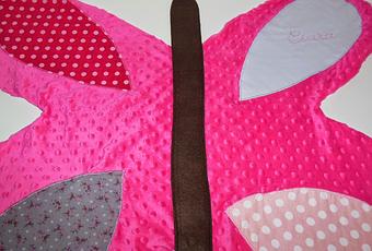 Il y a peu de temps, voici que je reçois une commande spécifique. La maman qui m'écrit utilise une commode pour poser la baignoire de sa fille. Seulement voilà, elle la protège avec une serviette éponge basique. La maman aimerait quelque chose de plus décoratif pour apporter un peu de couleurs dans la chambre.Je lui propose donc Léon le papillon. Il s'agit d'un joli papillon avec une face en éponge de coton rose clair pour absorber l'eau, et l'autre face plus déco est en minkee dots fushia avec des appliqués colorés pour les ailes. Alors après le bain, hop, on retourne le papillon et voilà une jolie décoration !