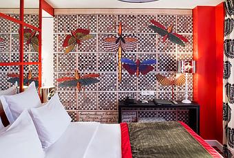 Que cet hôtel de charme se situe non loin du Musée d'Orsay, rien d'extraordinaire à cela ! Qu'il soit « ancré » au cœur du 7ème « aristocratique », et « lové » derrière une façade classique, commencera à représenter un certain attrait. Mais que cet élégant hôtel particulier abrite trente quatre chambres à la personnalité bien acérée toutes décorées et « vêtues » par Christian Lacroix au point d'être qualifié par certains de véritable écrin haute couture, cela pourrait devenir franchement intéressant ! Jouant d'une savante alliance entre audace et tradition « il » aura su mettre en scène l'esprit de bohème cher à son cœur et le néo-classicisme ! Trente quatre chambres toutes déclinées selon un thème de décoration, sept très précisément, Avenger, Tuileries, Jeu de Paume, Quai d'Orsay, Patchwork, Saint-Germain, ou Mousquetaires, réparties soit côté rue, soit côté cour, en version 4 ou 7 étages, soit contemporaines, soit, comme ils disent, plus académiques, si ce n'est, osons-le, campagnardes, une alchimie dont la chambre 8, au rez-de-chaussée, aura (un peu) bénéficié.Un espace de 24 à 25 m², façon junior-suite, canapé convertible rouge et or, murs tendus de tissus noir ou rouge, bureau de cuir clouté, mini-bar « inséré », fauteuils de velours mauve adaptés et literie en King Size « big » largeur planté, le tout « barricadé » derrière des baies vitrées sans espoir de pouvoir (trop) respirer, un peu angoissant sauf, le soir, avec toutes les lampes allumées ! Question fonctionnalité, cela me semblera avoir été (assez) bien étudié à l'exception, toutefois, de la porte vitrée pour les toilettes (bonjour l'intimité) et d'une douche curieusement « doublée », peut-être histoire de se réconcilier avec sa moitié ! Côté petit déjeuner, sur plateau, le jus d'orange pressé, les viennoiseries boulangères, les thés Mariage Frères, baguettes fraîches, confitures Alain Milliat, que du « beau monde » en fait, il ne saurait vous décevoir !