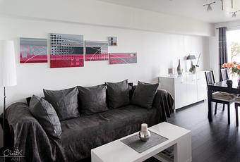 La cuisine ouverte constituait la seule touche de couleur framboise dans la pièce. Sa localisation à l’extrémité de l’ensemble provoquait un fort déséquilibre dans l’espace, formant un coin framboise soutenue alors que le reste de l’espace de vie restait en nuances de gris. Au dessus du canapé, un espace vierge était tout désigné pour accueillir un tableau contemporain moderne.