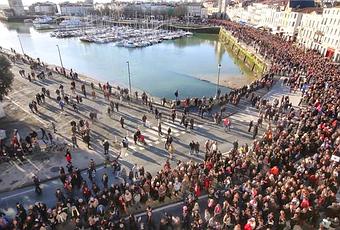 Or nous étions plusieurs dizaines de milliers de Charlie entre la Place de l'Hôtel de Ville, le port et la médiathèque Michel Crépeau* La participation à la mobilisation de La Rochelle a été réévaluée à 30 000 personnes. Un flux interrompu: la lente marche était ouverte par un groupe compact, serré, solidaire, emmêlé de très jeunes gens, des lycéens avançant avec une belle gravité suivi par le peuple rochelais et charentais.