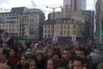 .... jamais les rues de Nancy n'avaient connu une telle affluence, de mémoire de Meurthe et mosellan. 50 000 personnes, selon les avis autorisés.... C'est plus que lors des manifs contre le FN, au début des années 2000, précédent pic de fréquentation. C'était vraiment impressionnant, de l'avis de tous ceux et celles qui y ont participé. Une manifestation particulièrement calme, pondérée et sans animosité, comme je n'en avais jamais vue. Une foule digne et attentive, simplement venue là pour dire non à la barbarie, d'où qu'elle vienne. Ni Charles Martel ni Charlots, nous étions tous Charlie, c'est à dire la liberté d'expression et de conscience, et l' attachement à nos autres libertés fondamentales ainsi qu'au journalisme d'opinion. Une manifestation loin de toute récupération politicienne, n'en déplaise aux fachos de tous poils, à qui nous avons dit NON aujourd'hui. Au point qu'ils se retrouvent si médiatiquement isolés.... Et c'est tant mieux. Pourvu que ça continue. Nous avons repris la rue à l'extrême-droite, qui l'avait un peu trop monopolisée à mon goût ces derniers temps... Nous allons maintenant devoir n ous attaquer à ce problème là aussi. Comme je l'écrivais il y a peu, eux comme les terroristes sont les deux versants d'une même haine de l'autre contre laquelle se battaient ceux de Charlie Hebdo.