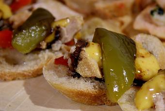 - Badigeonner au pinceau chaque morceau de pain d'huile d'olive. Disposer une lanière de poivron rouge, un morceau de thon, une petite cuillère à café de mayonnaise, une lanière de poivron vert et arroser d'un filet de crème de balsamique.