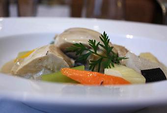 Suprême de volaille jaune pochée, sauce suprême, légumes de pot-au-feu, avec ou sans sa râpée de truffes. L’assiette est magnifique, riche, copieuse même, pochage parfait pour la volaille, moelleux, sauce remarquable pour un beau nappage du suprême. Le classique dans toute sa majesté et surtout dans ses saveurs bien marquées.