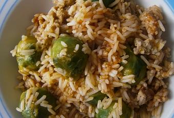 1) Faire chauffer une casserole d'eau bouillante et y faire cuire le riz. 5 minutes avant la fin de la cuisson ajouter les choux de Bruxelles. Egoutter et réserver au chaud