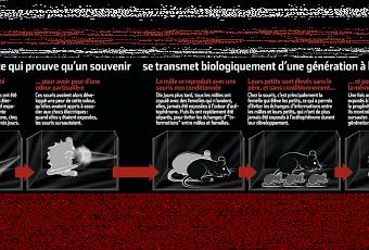 Des chercheurs ont appris à des souris mâles à avoir peur de l’odeur spécifique d’une molécule chimique. Ils ont associé plusieurs fois de suite cette odeur à un choc électrique. Dans les 10 jours qui ont suivi, ces mâles se sont reproduits avec des femelles qui n'avaient, elles, jamais été exposées à cette odeur. La descendance, élevée par les femelles, a instinctivement sursauté lors de sa première exposition à cette molécule chimique. Beaucoup plus que les descendants de souris qui n'avaient pas appris à la craindre, ou même qui avaient appris à craindre une autre odeur. Un comportement qui pouvait être transmis par les mères et qui persistait à la 3e génération. Conclusion : les souris avaient, à leur naissance, hérité d’une forme de souvenir appartenant à leurs parents, indépendamment de tout apprentissage. Elles savaient ce que leurs parents avaient, eux, dû apprendre par eux-mêmes.