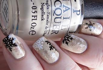 Flocons traditionnels On commence par des petits flocons tout à fait traditionnel. une base beige et des flocons noirs, blancs et dorés. J'ai rajouté quelques paillettes dorées en tapotant sur le beige avant de faire le stamping (il me semble avoir vu une manucure plus ou moins similaire chez 30etalors et pshiiit sur IG et sûrement chez d'autres, si vous l'avez faite aussi, je serais ravie de voir votre interprétation!).