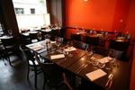 Une ambiance chaleureuse, intimiste, épurée, minimaliste, feutrée, apaisante, sans style démonstratif. Lumière vacillante des bougies, scintillements des suspensions dans les verres en contraste avec le wengé massif du sol, le bois du mobilier et les aplats orange chocolat des murs.