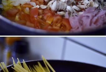- Prenez tous les ingrédients qui vous inspirent. Chez moi, ici : 1 oignon, quelques champignons de paris, 3 tomates, du jambon, 1 gousse d'ail, quelques gouttes de tabasco. J'aime bien aussi y ajouter quelques tomates séchées & marinées, mais ce jour là je n'en avait pas. - Émincez tous vos ingrédients. - Faites chauffer un filet d'huile dans une poêle & balancez y vos ingrédients. Laissez les revenir à votre convenance. Perso j’attends simplement que les tomates fraiches soient réduites en bouillie/sauce. - Ajoutez y une bonne poignée de spaghettis ( ou n'importe quelles autres pâtes ) & recouvrez avec le volume d'eau que vous estimerez convenable, puis émiettez y un cube de bouillon. - Laissez mijoter le temps qu'il faudra pour que les pâtes soient cuites & que l'eau soit complètement évaporée.
