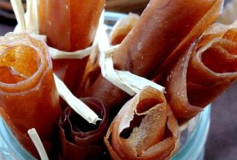 2. Etalez la compote à l'aide du dos d'une cuillère uniformément et le plus finement possible. Laissez sécher dans un four à 100 degrés (5 heures pour moi). Le cuir ne doit plus coller au doigt mais doit êtee encore souple. Décoller délicatement le cuir du papier de cuisson puis coupez en bandes pour faire des rouleaux.