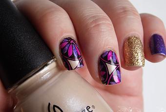 Ce nailart m'a permis de tester un petit qui dort depuis bien trop longtemps dans ma vernithèque: Anthem de Dance Legend. Il est plutôt sympa, un violet électrique très fortement holo. La présence de quelques flakies m'a plutôt dérangé et du coup je suis assez mitigée et je me demande si je ne vais pas lui trouver une nouvelle maman...Pour les paillettes, j'avais bien trop hâte de tester Ica Valley de Cirque, depuis le temps que je l'attendais. Vous le voyez ici en deux couches sur l'annulaire. Il est très pailleté donc forcément blingbling mais en même temps pas totalement opaque et donc ça passe plutôt bien, je suis ravie en tous cas!
