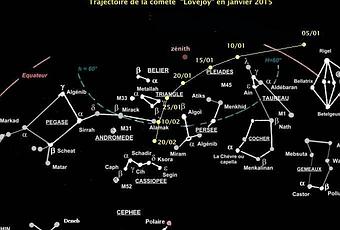 Le 25/01 lever à midi et coucher vers 01h, visible près du Triangle (au-dessus de Persée)