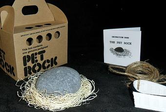 Le Pet Rock™ est un animal de compagnie qui se présente sous la forme … d’une pierre. Accompagnée d’un peu de foin pour lui tenir chaud, le tout dans une boîte (trouée, pour qu’elle respire), cet objet (très sentimental) est vendu $3.95 pour un coût total de $0.95 ! Pour couronner le tout, un manuel est inclu dans la boîte, comprenant de nombreux conseils pour laver, promener et même dresser votre animal de compagnie (les ordres sont pour l’instant limités à « pas bouger » et « assis »).