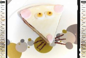 Posez une part dans une assiette et décorez avec la pâte à sucre pour les oreilles et nez puis les oeufs pour les yeux avec un peu de nutella au milieu puis les moustaches avec du nutella