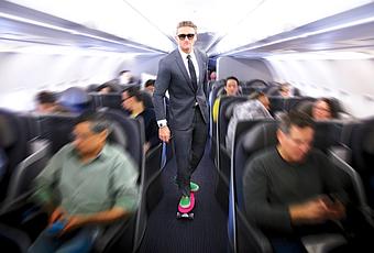 Le réalisateur Casey Niestat vêtu du fameux costume parcours 12 000 miles sans qu’il ne se froisse ni ne s’habite.