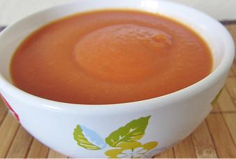 Un velouté épais, épicé et coloré, voilà de quoi se réchauffer au plus froid de l'hiver. Le mélange patate douce tomate et curry donne une soupe bien relevée, qui change des mélanges de légumes habituels en cette saison ; je préfère dès qu'on sort de l'été ne plus utiliser de tomates fraîches et prendre plutôt des tomates en conserve ou un bon concentré de tomates qui apportera plus de goût.
