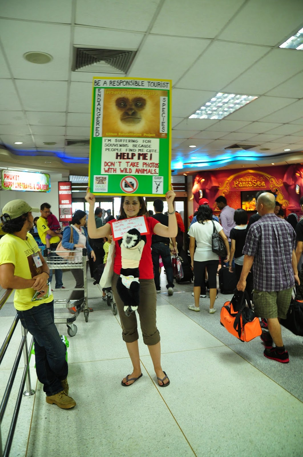S’il vous plaît, ne faites pas de photos avec des gibbons ou d’autres animaux sauvages. N’encouragez pas ce trafic. Derrière chaque bébé tout mignon se cache un trafic très cruel : ce bébé a vu toute sa famille mourir sous les coups de fusil d’un braconnier. Lorsque sa mère a chuté, ce bébé a été arraché au cadavre de sa maman. Bien souvent plusieurs familles sont tuées car le bébé ne survit pas tout le temps à la chute (entre 20 et 50 m de haut). Le sort réservé au survivant est terrible : il est drogué, battu, affamé pour être contrôlé. Vers l’âge de 5 ans, les canines apparaissent, ils deviennent trop agressifs et incontrôlable pour être utilisé comme accessoire photo. Il est alors tué et un autre bébé prend sa place…