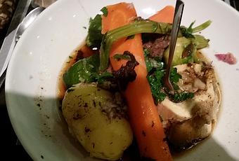 Un peu au coude-à-coude, il faut l’admettre, car le lieu est assez petit. Mais on s’en accommode, tant on se régale ! Le pot-au-feu, facturé 17€ est magnifique, tant par sa présentation très colorée que par son goût et sa fraîcheur. Copieusement servi, avec des carottes, des courgettes, des choux de bruxelles, du céleri, un os à moelle et parsemé de coriandre. La viande (du paleron) était tendre et peu grasse, un délice. La baguette de campagne était croustillante à souhait. Les produits sont ultra-frais, ce qui est suffisamment rare pour être souligné, comme on trouve de plus en plus souvent des plats sous vides même dans des enseignes prestigieuses.