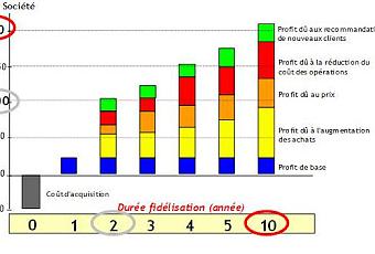 - Le profit du à une augmentation des achats (Up Selling ou Cross Selling). Ce profit additionnel peur rapidement dépasser le profil de base et augmenter en proportion des années