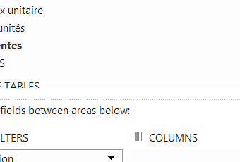 Un tableau croisé dynamique comprend 4 sections: les valeurs, les étiquettes de lignes, les étiquettes de colonnes et les filtres. Par défaut, lorsque vous cochez un champs numérique, afin de l’ajouter à votre tableau croisé dynamique, celui-ci apparaît automatiquement dans la section des valeurs et lorsque vous cochez un champs textuel, celui-ci apparaît automatiquement dans la section des étiquettes de lignes. Par la suite, vous pouvez simplement cliquer sur les champs et les glisser dans la section de votre choix. Par défaut également, Excel présente la somme des valeurs.