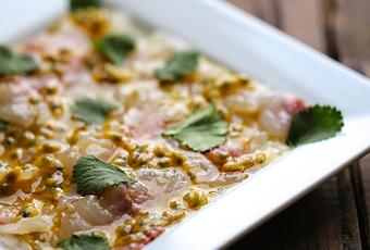 Découpez des tranches très fines dans les filets de dorade . Disposez les sur les assiettes de présentation. Dans un bol fouettez l'huile d'olive et les fruits de la passion . Répartissez la vinaigrette sur les tranches de poisson, ajoutez des feuilles de coriandre et de la fleur de sel . Servez sans attendre avec du pain grillé ou des crackers .