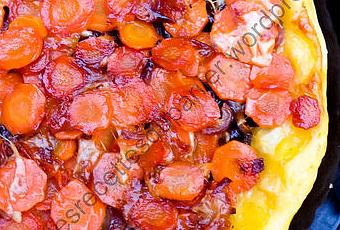 Form an uniform layer of carrots in the bottom of the pan. Arrange the onion-tomato mixture on top. Put the cheese slices over it. Cover with the puff pastry.