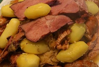 - Pendant ce temps peler les Pommes de terre, les laver. Les cuire 40 minutes avant la fin de cuisson Totale de la Choucroute Garnie (donc pas de suite).