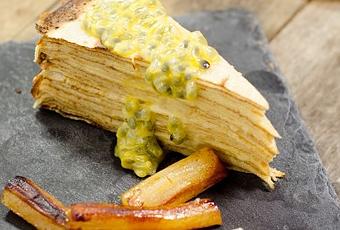 Pour la chandeleur, voilà encore une recette de crêpes au levain (on peut utiliser une recette plus classique comme celle-ci), montées en gâteau, et accompagnées des ingrédients d’un superbe dessert cuisiné et dégusté récemment à l’Air du Temps: les crêpes sont garnies d’une crème au sucre muscovado, servies avec d’étonnants salsifis cuits au sirop et caramélisés au beure, une touche d’acidité apportée par le fruit de la passion, et une glace au vieux rhum cubain et raisins pour encore plus d’onctuosité et de fraicheur!