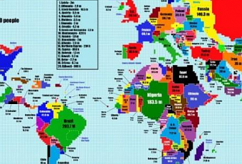 Dans mon dernier article je vous parlais du développement de la population mondiale et de la difficulté de prévoir la consommation de certains pays à la démographie galopante .Ce graphique vous en montre l’effet : voici la taille que certains pays devraient présenter sur la base de « surface identique pour chaque homme de n’importe quel pays » …REGARDEZ A QUEL POINT LES ASPECTS DES DIVERS CONTINENTS EN SERAIENT BOUSCULES !Mon public de PRINCETON avait été sensible à mes »appels du pied » malthusianistes !L’UNIVERS TERRESTRE EST LIMITÈ !