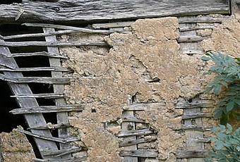 Le torchis est considéré comme le premier matériau composite de l'histoire, composé de terre et de renforts (fibres végétales ou poils d'animaux). Les clayonnages étaient faits de bois souples et pas trop putrescibles, et des lianes de clématite, assouplies par trempage ou cuisson, étaient utilisées pour la finition, entre le haut des murs et la toiture.