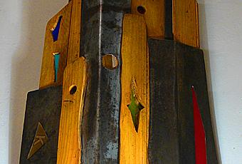 Lizaplik - Applique murale rétroéclairée réalisée à partir de pièces de bois et de métal sculptées. Fenêtres rétroéclairées en pmma de différentes couleurs vives. Patine du bois cire & pigments de couleurs. Acier brossé et passé au graphite. Dimensions 45 cm x 100 cm env.