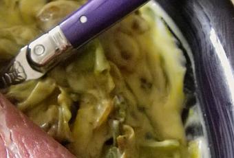 Cela pourrait presque être une recette bretonne. Le jambon blanc est une spécialité locale. Les poireaux et les oignons y poussent avec vigueur. La crème y est riche. Le plat de présentation a été fabriqué par Appolia à Languidic, en plein coeur du Morbihan dans une pâte céramique en argile et kaolin breton.Il n'y a que les couverts qui auront été usinés par Jean Dubost près de Thiers et la moutarde qui vient des Pyrénées (comme quoi il n'y a pas que Dijon a en avoir le monopole). Elle est signée par Sur les Quais ... nous revoilà malgré tout dans une évocation de bord de mer.