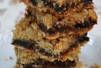 Ingrédients (pour 12 carrés) :150 g de fruits secs mélangés (par exemple : raisins de Corinthe, pruneaux, abricots, dattes, figues et cerises)75 ml d’eau bouillante130 g de farine75 g de flocons d’avoine2 c. à s. de noix de coco séchée (facultatif)70 g de sucre ordinaire30 g de sucre non-raffiné (ou de cassonade corsée)½ c. à c. de bicarbonate de soude alimentaire1 c. à c. de cream of tartar (facultatif)50 g de beurre45 ml d’huile de noix (3 c. à s.)1 - 2 c. à s. de lait
