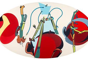 Le fond joue la page blanche ou s’articule en rectangle de couleurs saturées. La toile elle-même peut être articulée en plusieurs châssis car Télémaque questionne la tradition du cadre, allant jusqu’au tondo, au trapèze, au triangle.