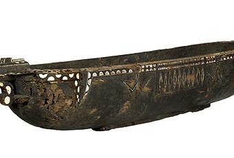 "Pièce de bois monoxyle sculptée à l’herminette, en forme de pirogue reposant sur une base. La surface intérieure et extérieure est recouverte d’un enduit brun-noir, le décor est gravé et incrusté de nacre de nautile et de coquilles de tridacne fixées à la résine de noix de parinarium, ou peint au pigment blanc, à motifs de nageoires de bonites, de frégates et de dessins abstrait. Une tête de bonite est sculptée aux deux extrémités."