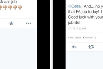Vexé, son ex-futur patron n’a pas tardé à lui répondre également par un tweet (ci-dessous). À peine embauchée et déjà virée. Une mésaventure qui a amusé Cella : « Je me suis fait virer via Twitter LOL » ainsi que les internautes : « Félicitations ! Première personne à se faire virer avant même d’avoir commencé à travailler ! », a notamment commenté un twitto rapporte 20 Minutes. Bref, pas très malin d’étaler ses humeurs sur la toile.