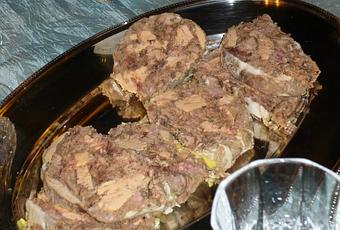 Le repas se poursuit avec les rouges, dès la deuxième entrée. J'ai confectionné une galantine de lièvre à la royale. J'ai cuit le lièvre selon la recette classique, puis j'ai prélevé la viande, et j'ai superposé de la farce et du foie gras de canard. J'ai serré le tout dans du lard très fin, puis j'ai cuit au torchon dans un bouillon épicé.