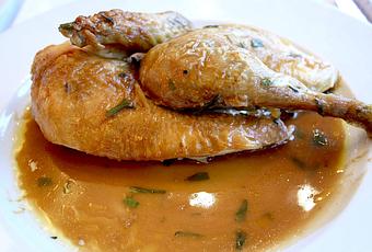 Plaisir supplémentaire dans une époque où l’on ne sert que les suprêmes, on peut ici goûter le blanc et la cuisse aux saveurs et aux textures très différentes.
