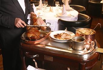 Il arrive superbe et généreux, sortant des cuisines tout fumant et bien rôti, la peau parfaitement grillotée et dorée. Sur la belle table de découpe, en salle, le maître d’hôtel officie avec un talent et une dextérité acquise au fil des années. Belles tranches du milieu du gigot, rouges et légèrement saignantes, jusqu’à l’entame plus cuite, il y en a pour tous les goûts. En prime, pour les connaisseurs, un morceau de la souris, ce morceau tendre et goûteux du bas du gigot, qui vient parachever une assiette magnifique.