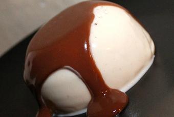 Pour la ganache, j'ai utilisé des chocolats de Noël, il nous en reste toujours trop et on sait qu'on ne va pas les manger. Donc 50g de chocolats de Noël et 50g de lait de coco, faire fondre doucement. Au moment du dessert, faire chauffer un bol d'eau, plonger le fond des verrines quelques secondes puis démouler les verrines dans les assiettes, napper de sauce chocolat.