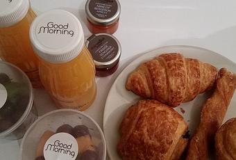 Ce matin, à 6h59, un livreur souriant me tend deux sacs en carton sur le pas de ma porte. Pas encore bien réveillée, je découvre les douceurs qui m’ont été apportées : deux bouteilles d’orange pressée, deux salades de fruits, des viennoiseries de la Pâtisserie des Rêves : 1 mini croissant, 1 mini pain au chocolat pointe de noisette, 1 mini brioche feuilletée, 1 mini kouign-amann. Et deux petits pots de confiture Alain Milliat (fraise et abricot). Ce petit déjeuner, accompagné d’un thé, était tout simplement délicieux. Tout était extrêmement frais, digne de ce qu’on trouve dans les meilleurs hôtels.