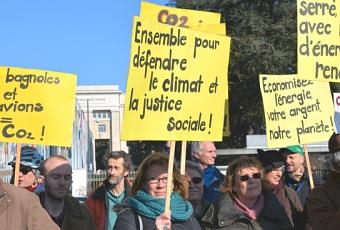 En marge d’une réunion internationale sur le climat qui se déroule actuellement au siège de l’ONU jusqu’au vendredi 13 février a eu lieu aujourd’hui une manifestation pacifique mais néanmoins non autorisée sur la place des Nations. Environ 200 personnes essentiellement des militants de gauche ont répondu à l’appel de la “Coordination climat et justice social.” Prises de parole et flashmob “danse” en attendant la conférence publique “pour un engagement social pour le climat” à 18h à la Maison des associations. La police a intervenue pour mettre fin à ce rassemblement qui s’est déroulé dans le calme.