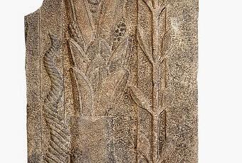 L'archéologue Blömer décrit l'image ainsi: "La stèle de basalte montre une déité poussant d'un calice de feuilles. Sa longue tige sort d'un cône orné de symboles astraux. Sur les côtés du cône poussent une longue corne et un arbre que la déité serre d'une main. Les éléments picturaux suggèrent qu'il s'agit d'un dieu de la fertilité."
