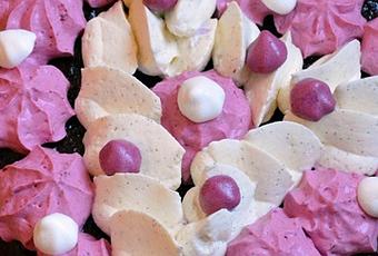 Démouler le gâteau, éventuellement lisser la gelée de cassis du gâteau pour avoir un beau résultat puis garnir le gâteau avec les deux mousses.