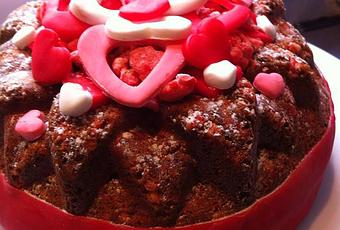 Décorer le dessus avec les petits coeurs et les brisures de pralines roses, saupoudrer d'un peu de sucre glace.