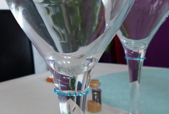 J'ai trouvé en magasin spécialisé dans la déco de table (on en trouve aussi sur internet de toutes les couleurs) de petites perles auto-collantes initialement prévues pour les faire-parts mais qui peuvent tout à fait habiller vos verres pour une soirée !