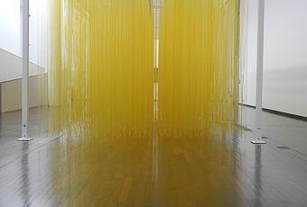 Un document accompagnant l’exposition à la Galerie Jean Collet mentionne des mouvements artistiques dont l’oeuvre de Philippe Richard est proche. J’allais au Mac-Val. Ce serait l’occasion d’en retrouver l’expression : Daniel Dezeuze, Claude Viallat, entre autres. Et, bien sûr, Jesus Rafael Soto. Dandylan (lien dans la colonne de droite) en a vu le Pénétrable bleu à la Galerie Perrotin ; ici, ce sera le Pénétrable jaune (photo ci-contre) et d’autres oeuvres dans une grande salle. Mais il y a aussi les cadres de Cécile Bart qui déstructurent l’espace, le Déclassement d’Eva Nielsen, une oeuvre d’Alain Jacquet intitulée Bulldozer, les tracés de Rainier Lericolais, les formes évoquant un labyrinthe de Peter Stämpfli (et c'est à Krijn de Koning que je pense). Autant d’artistes qui me semblent s’inscrire dans une même recherche que Philippe Richard, heureusement avec des procédés différents et, sans doute, des intentions qui les dissocient.