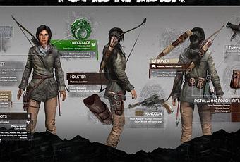 C’est via gameinformers que Crystal Dynamics nous propose de découvrir le futur équipement de Lara dans Rise of the Tomb Raider. Bien pratique pour les futurs cosplay, car on apprend ainsi quel collier la belle portera. On retrouve aussi les holsters, les info sur l’écharpe, le pantalon etc… Coté arme, on retrouve l’arc, les couteaux, piolet ...