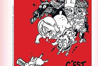 On y voit tout un ensemble d'antagonistes pourchasser le journal Charlie Hebdo: un djihadiste, un chien d'attaque avec une kalachnikov, le pape François, Nicolas Sarkozy, Marine Le Pen et BFM TV.