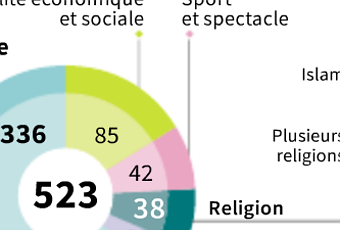 • Parmi les « unes » relevant de l’actualité économique et sociale, un peu plus de 50 % portent sur les mouvements sociaux ou sur les Français en général , 21 % portent sur les sexes ou la sexualité, 18 % portent sur la délinquance, la violence politique ou le terrorisme, et 6 % portent sur les relations entre générations.