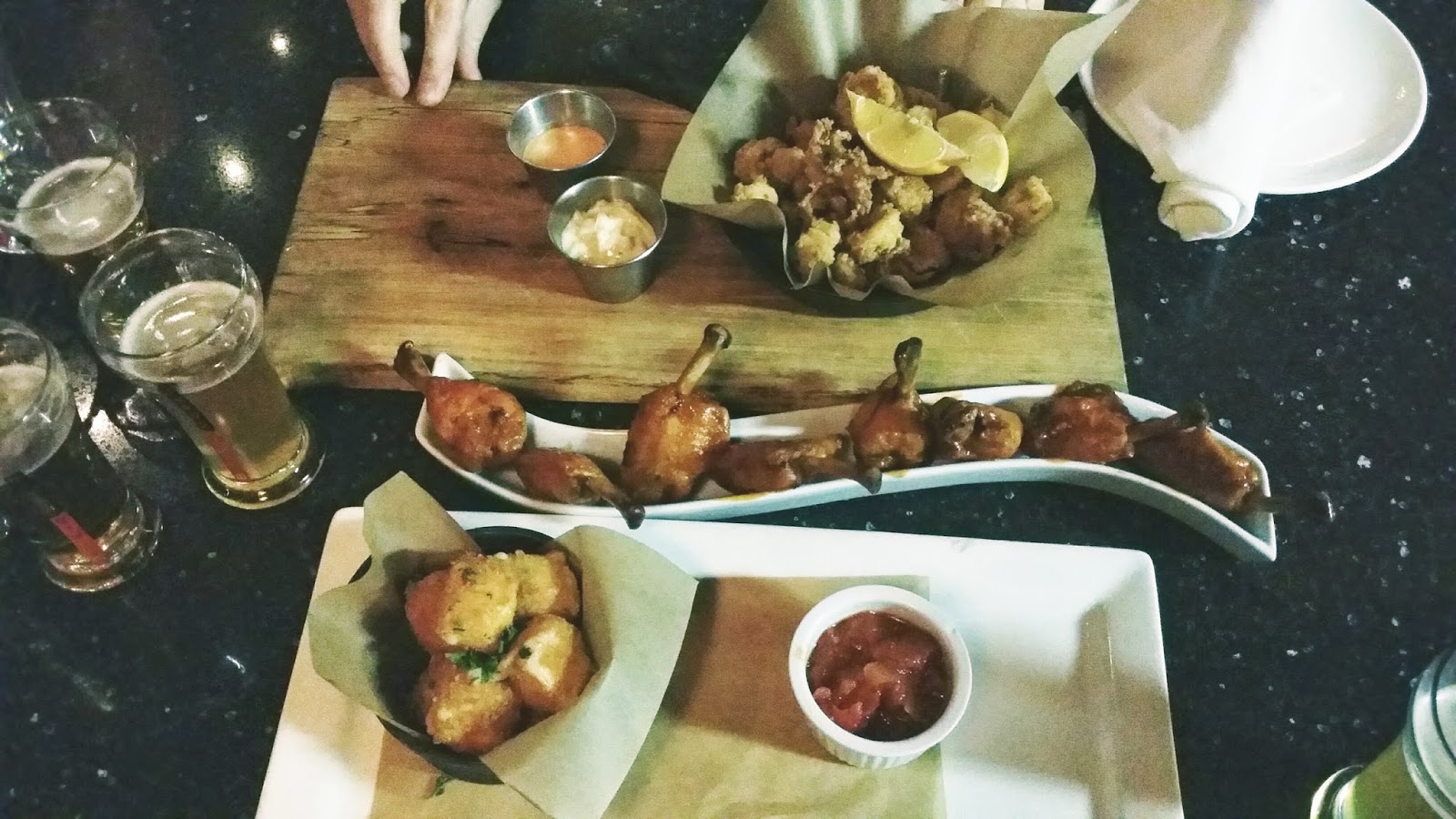 J'ai toujours entendu "les autres" se proclamer fans de bière. Je n'avais jamais pris le temps de ME poser sérieusement la question, suis-je fan de bière moi aussi? Une soirée en tête à tête avec Husband au Bier Markt m'aura suffit pour confirmer le tout! J'adore la bière et je me découvre une soif inextinguible pour en faire la découverte. Il existe autant de sorte de bières qu'ils existent de personnalités et le restaurant le Bier Markt de Montréal peut s’enorgueillir de nous faire découvrir un impressionnant assortiment composé de plus de 150 fabuleuses bières en provenance d'ici et d'ailleurs.Fan de bières ET fan de hockey et spectacles? Une combinaison gagnante pour le Bier Markt du centre-ville de Montréal grâce à sa situation géographique on-ne-peut-plus-parfaite. Ce dernier situé à quelques pas à peine du centre Bell permet aux partisans du tricolore de ne rien manquer des parties de hockey disputés le soir venu. Distribué sur 3 étages, le Bier Markt accueille sa clientèle pour un 5 à 7 façon bar-apéro au premier étage où certains soirs, on a la même la chance de trinquer avec un band live en trame de fond. Le second étage reçoit des invités assis qui souhaitent déguster un gourmand repas en toute quiétude, tandis que le 3ème étage, véritable salon privé, est exclusivement destiné aux réservations VIP et celles d'affaires. Une fois assis à notre table, Husband et moi sommes accueillis par le chef Michael qui sans hésiter, s’assoit avec nous pour détailler la carte des bières (bien entendu!) et finalement le menu. TOUT semble délicieux. Après ces explications, c'est au tour d'un serveur de nous souhaiter la bienvenue avec une roulette à dégustation de bières. En fait, la philosophie derrière cette chaîne culinaire Canadienne est que "chaque plat mérite sa bière".